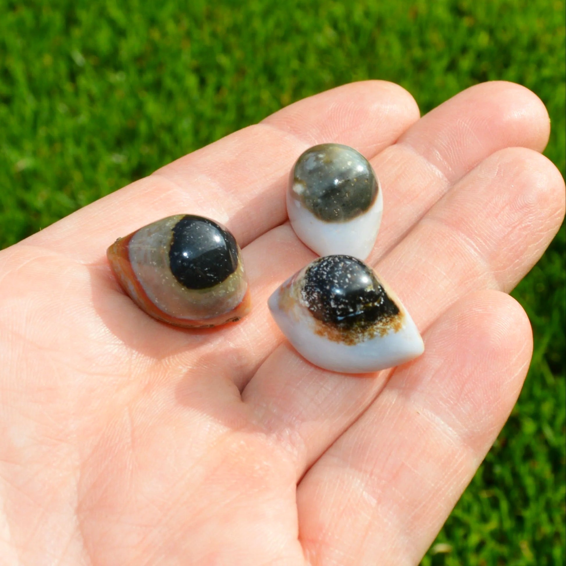 - Dieser Augenachat zeigt das charakteristische, konzentrische Augenmuster, das ihn so unverwechselbar macht. Je nach Stein wird er auch als Shiva Auge, Kuhauge oder Sardonyx bezeichnet. Die Muster entstehen durch natürliche Ablagerungen und Bänderungen von Mineralen, wodurch jeder Stein zu einem einzigartigen Unikat wird.