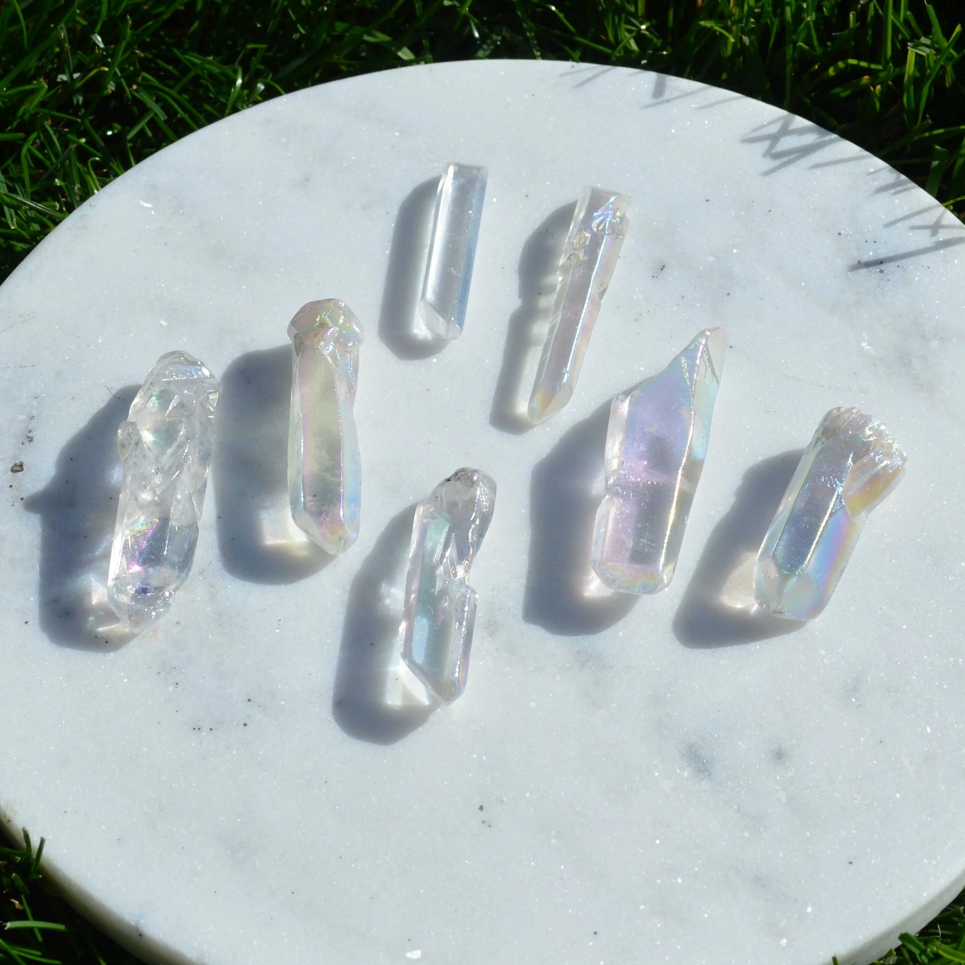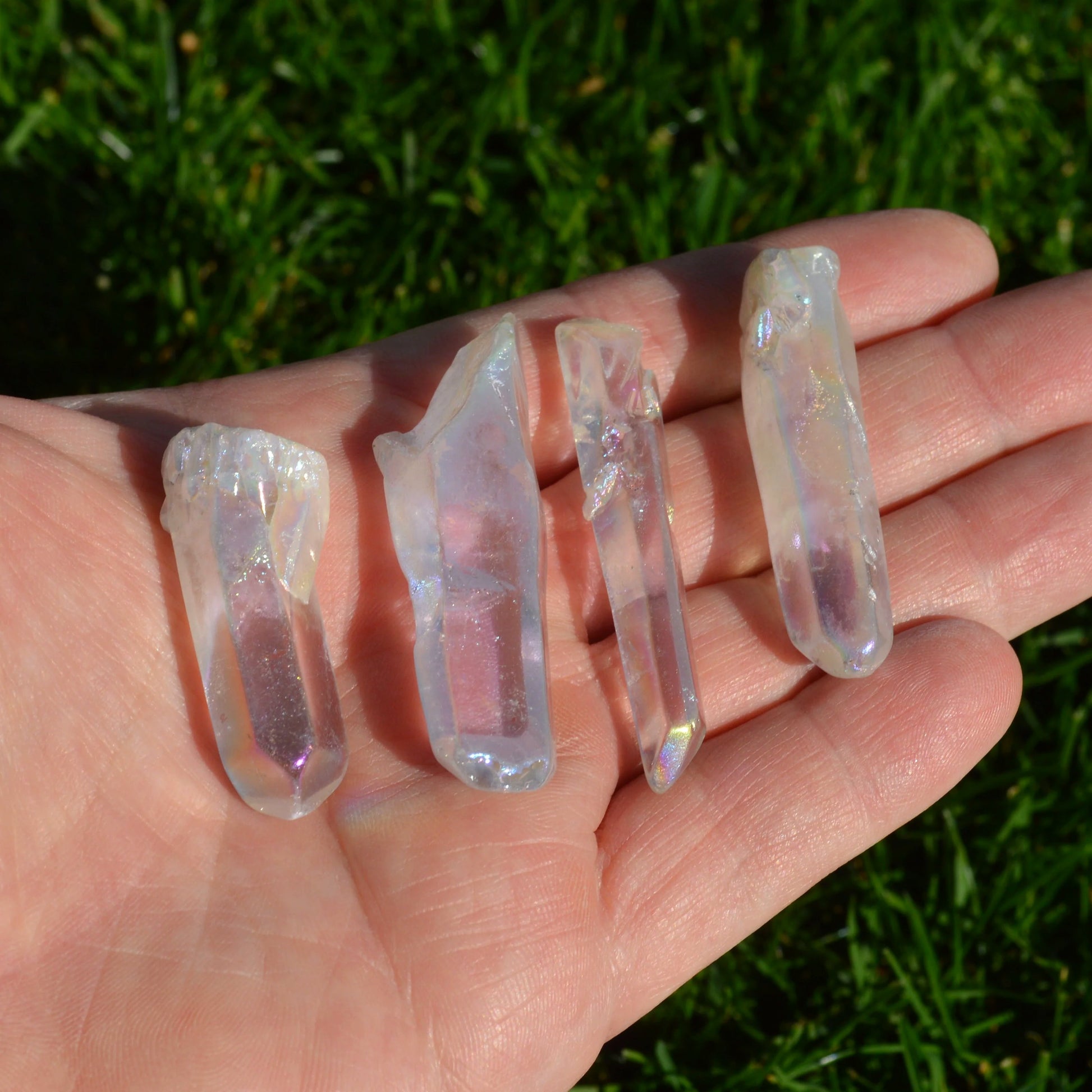 - Angel Aura ist ein Bergkristall, der mit Gold oder anderen metallischen Elementen bedampft wird. Durch diese spezielle Behandlung entsteht sein schillernder, irisierender Glanz, der an Regenbogenfarben erinnert. Die Pink-Gelb-Blau oder Lila-Aura ist zusätzlich zur Bedampfung auch gefärbt.