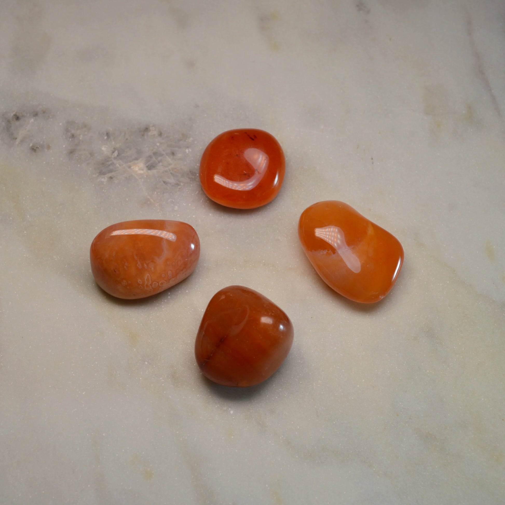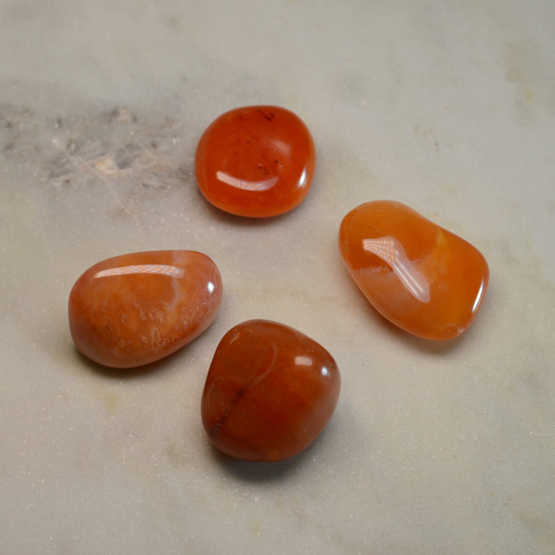 - Die Farbe der Karneol-Trommelsteine kann von Orange bis hin zu tiefem Rot variieren.