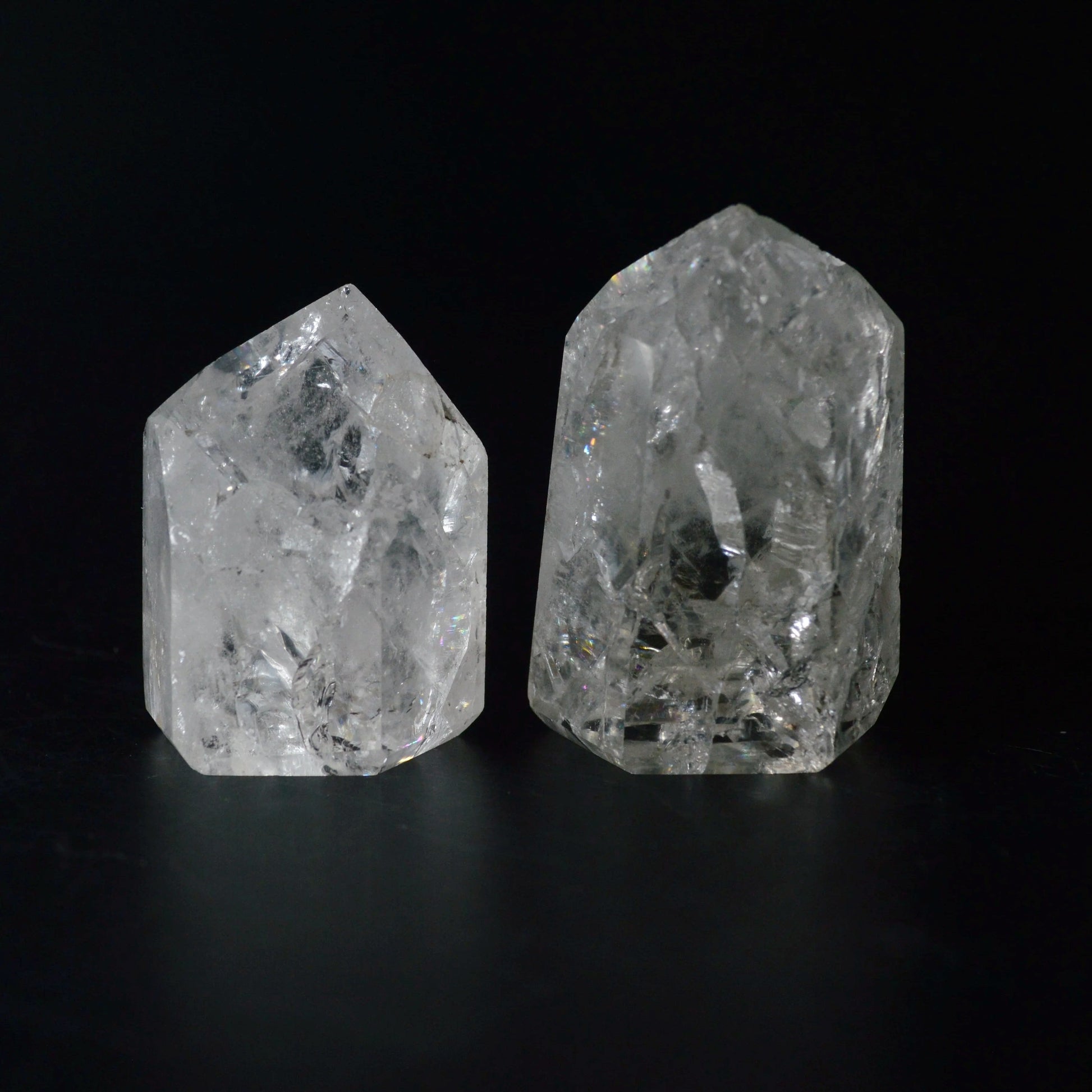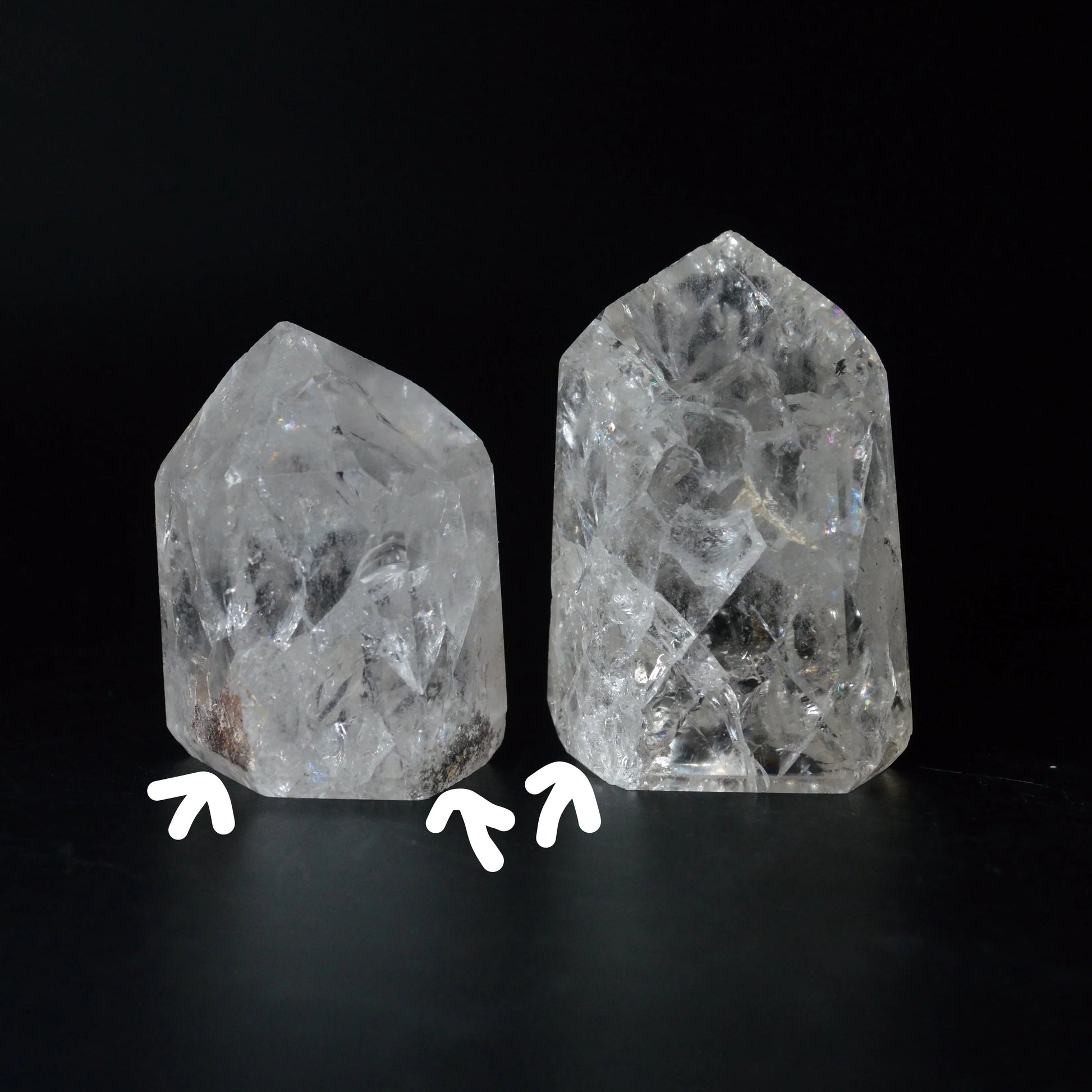 SALE-Hinweis: Die rechte Cracked Rainbow Bergkristall-Spitze ist noch verfügbar. Sie weist eine kleine, nur bei genauem Hinsehen oder Fühlen erkennbare Bruchstelle auf. Die gelbliche Einkerbung in der Mitte ist völlig natürlich.