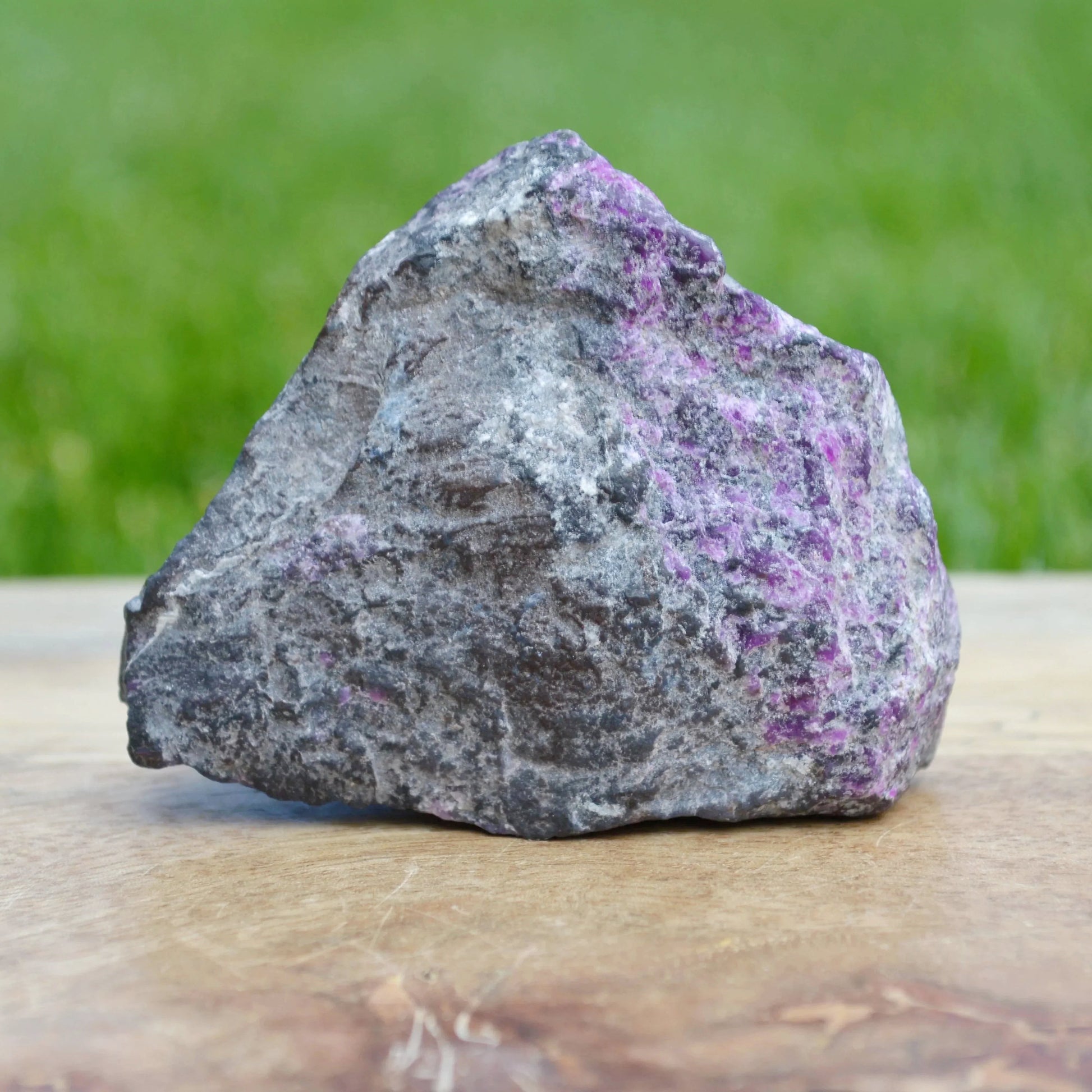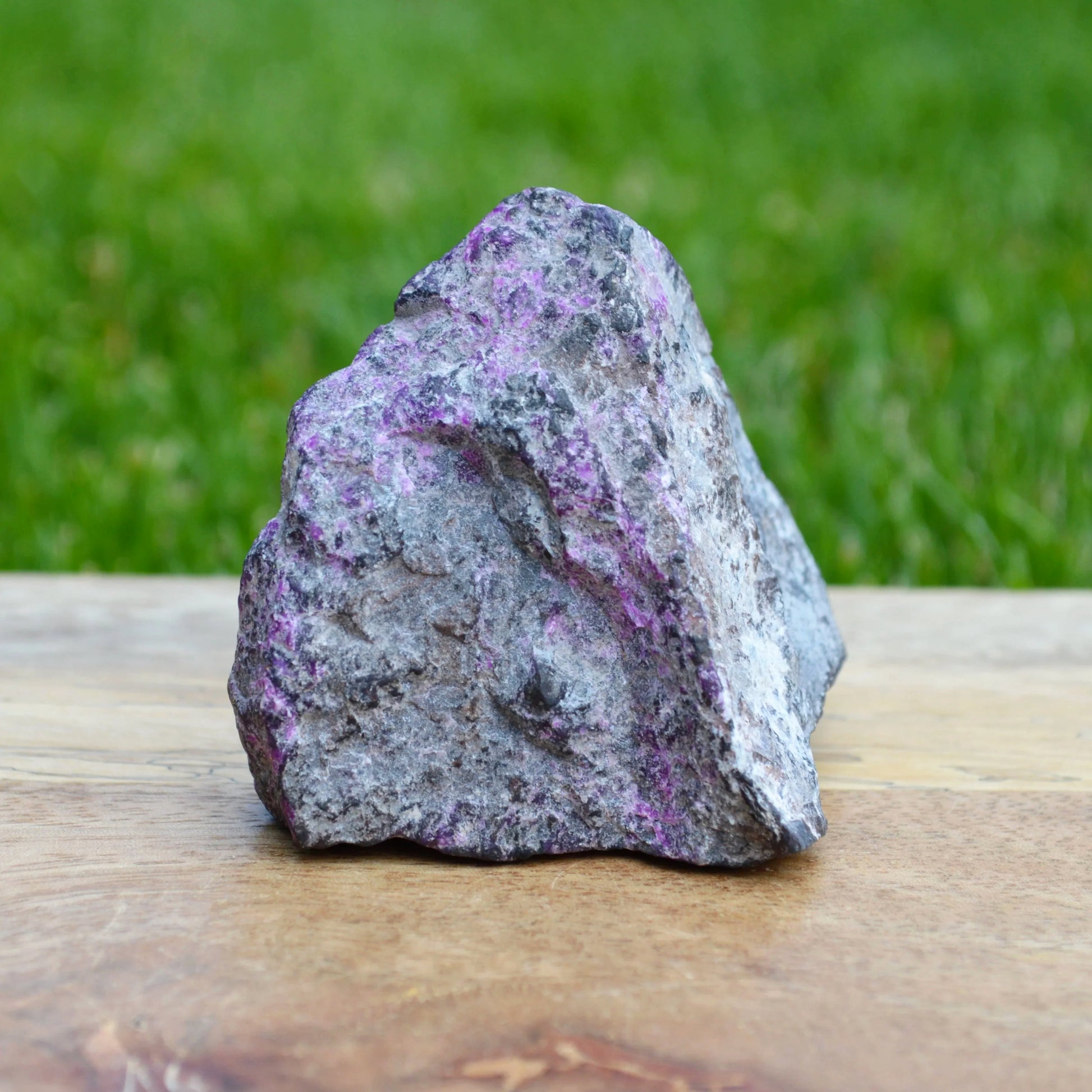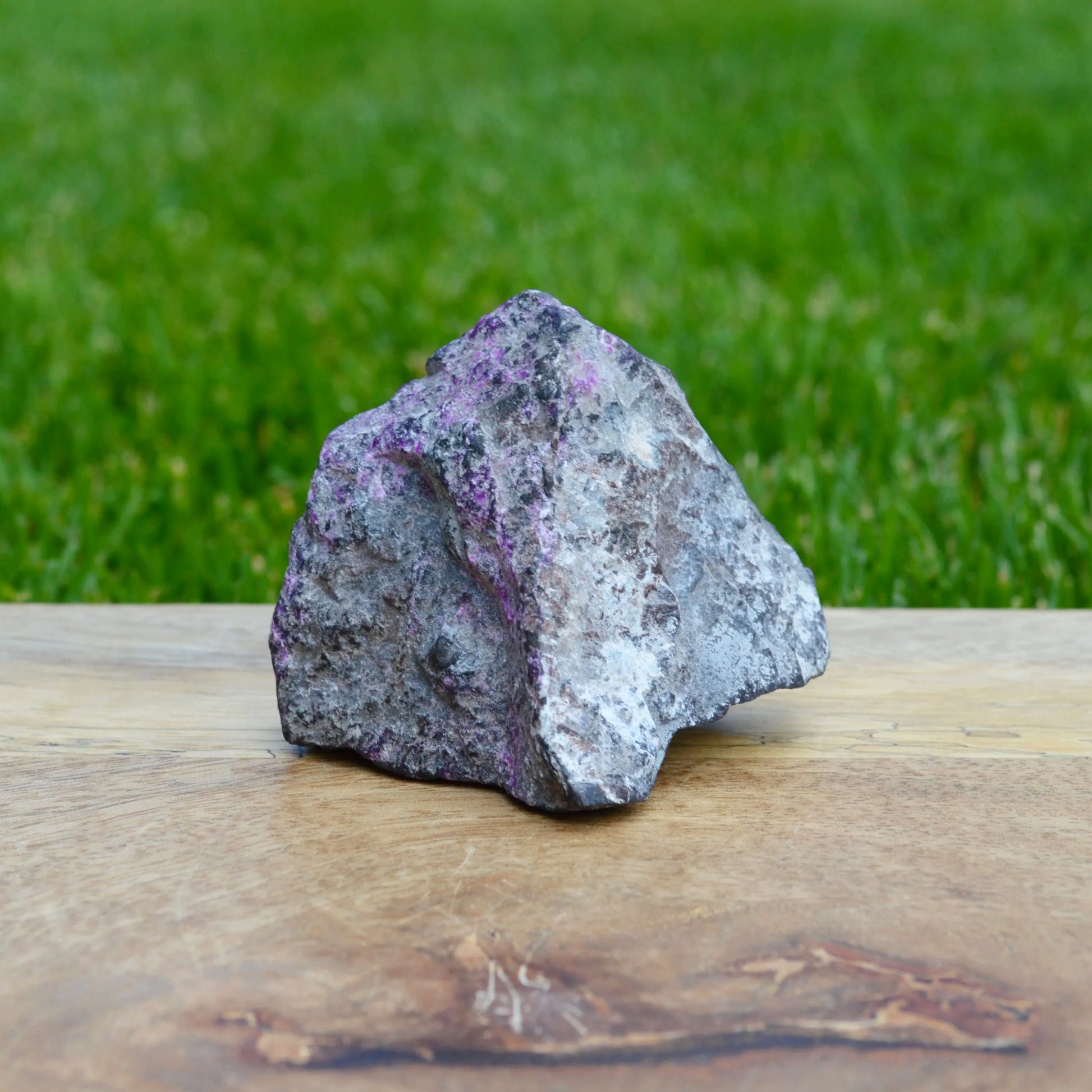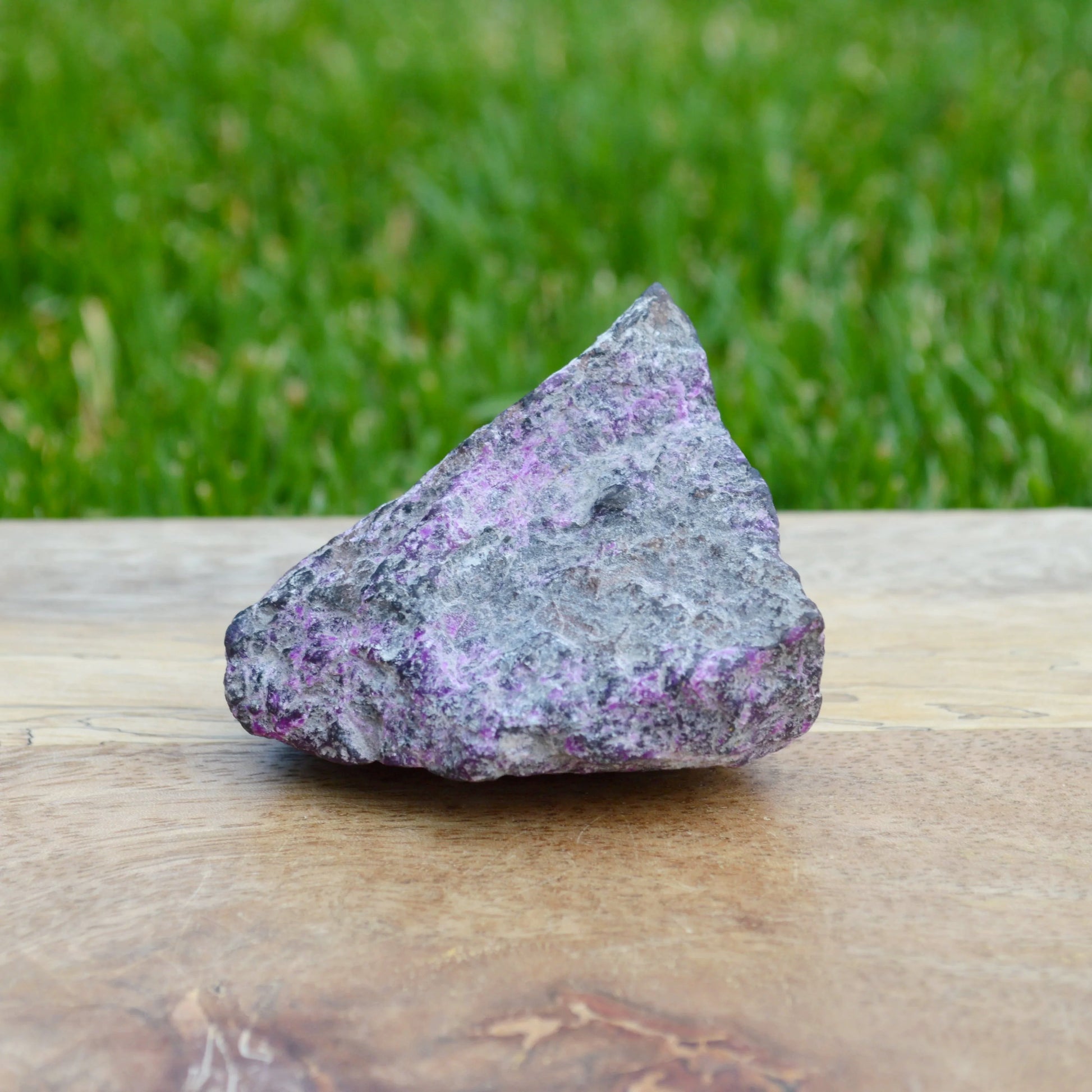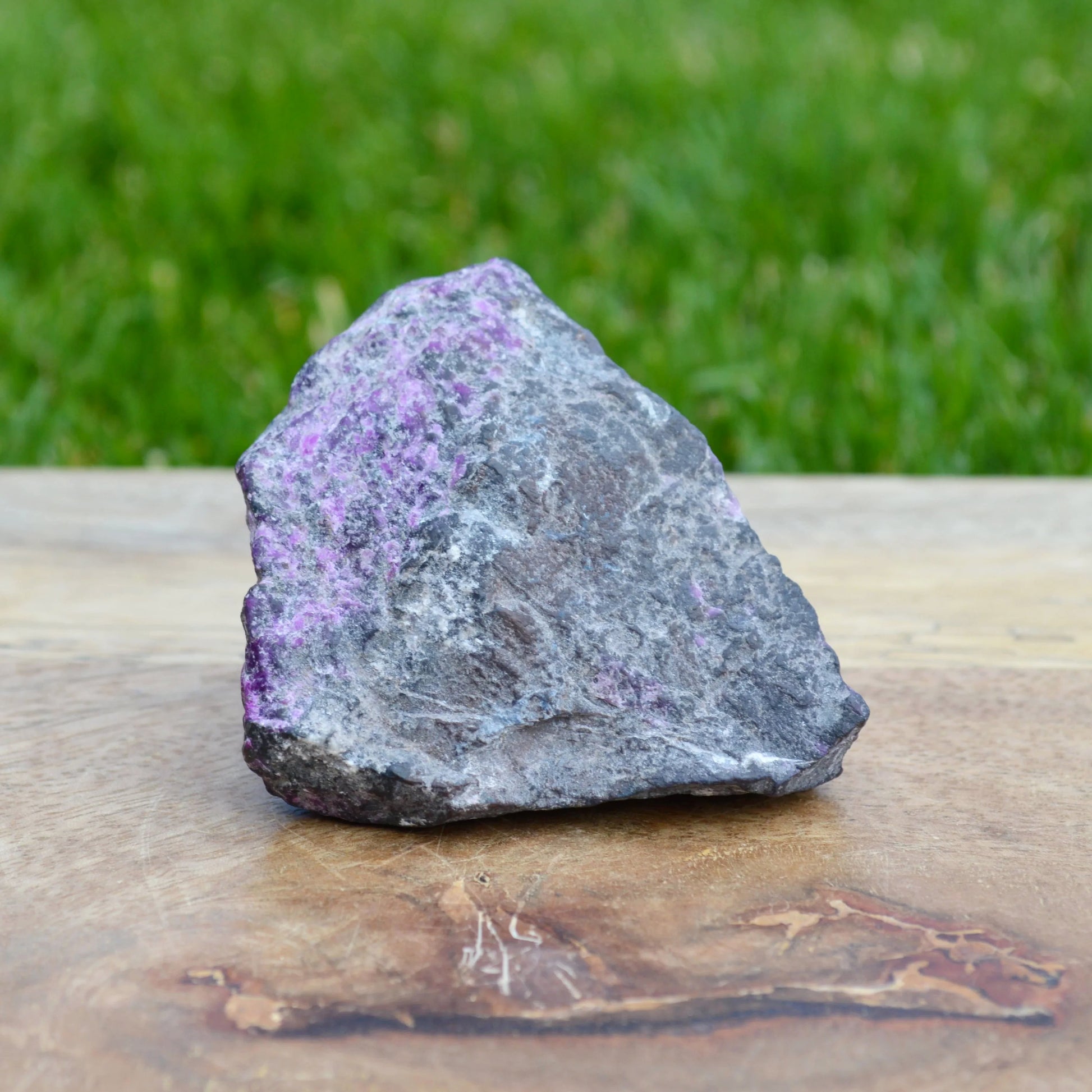 - Dieser Sugilith Rohstein fasziniert mit seiner typisch purpur/violetten Farbe. Die Sugilithkristalle erstrecken sich dabei über einen wesentlichen Teil des Muttergesteins. Besonderes Highlight sind die feinen Richterit Einschlüsse, die punktuell auf der Oberfläche sichtbar sind.